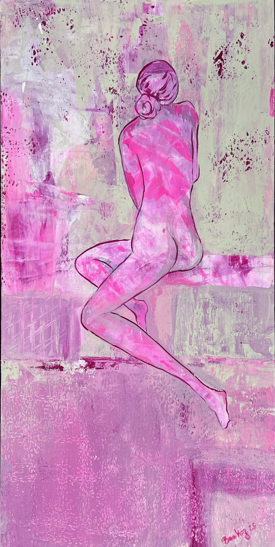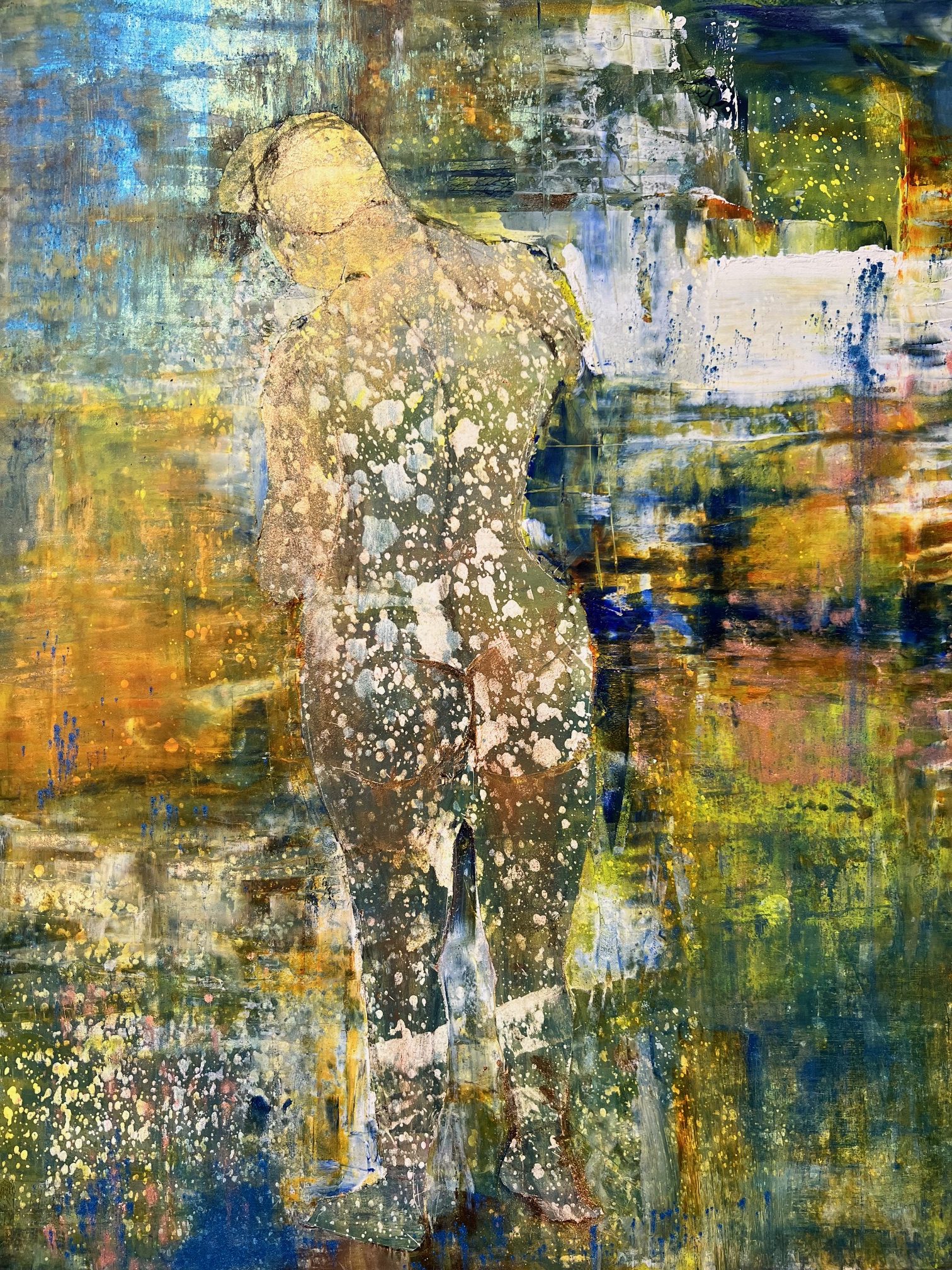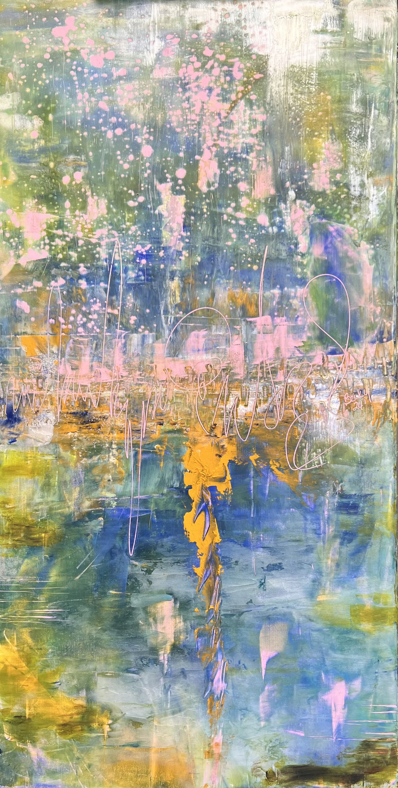 I work in layers, beginning with loose marks and soft shapes, letting them gradually shift between structure and spontaneity until semi-figurative forms emerge and the painting reveals the feeling it was meant to hold.